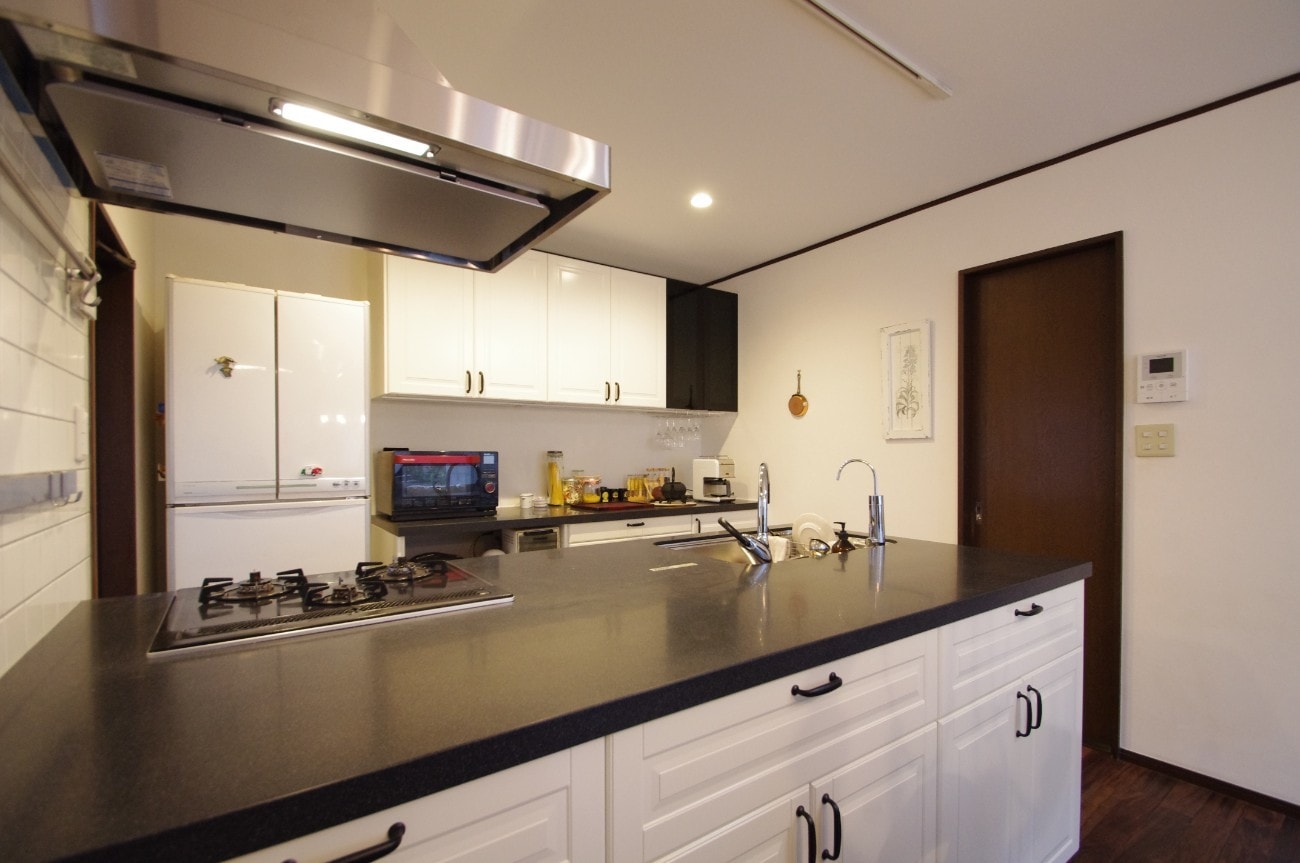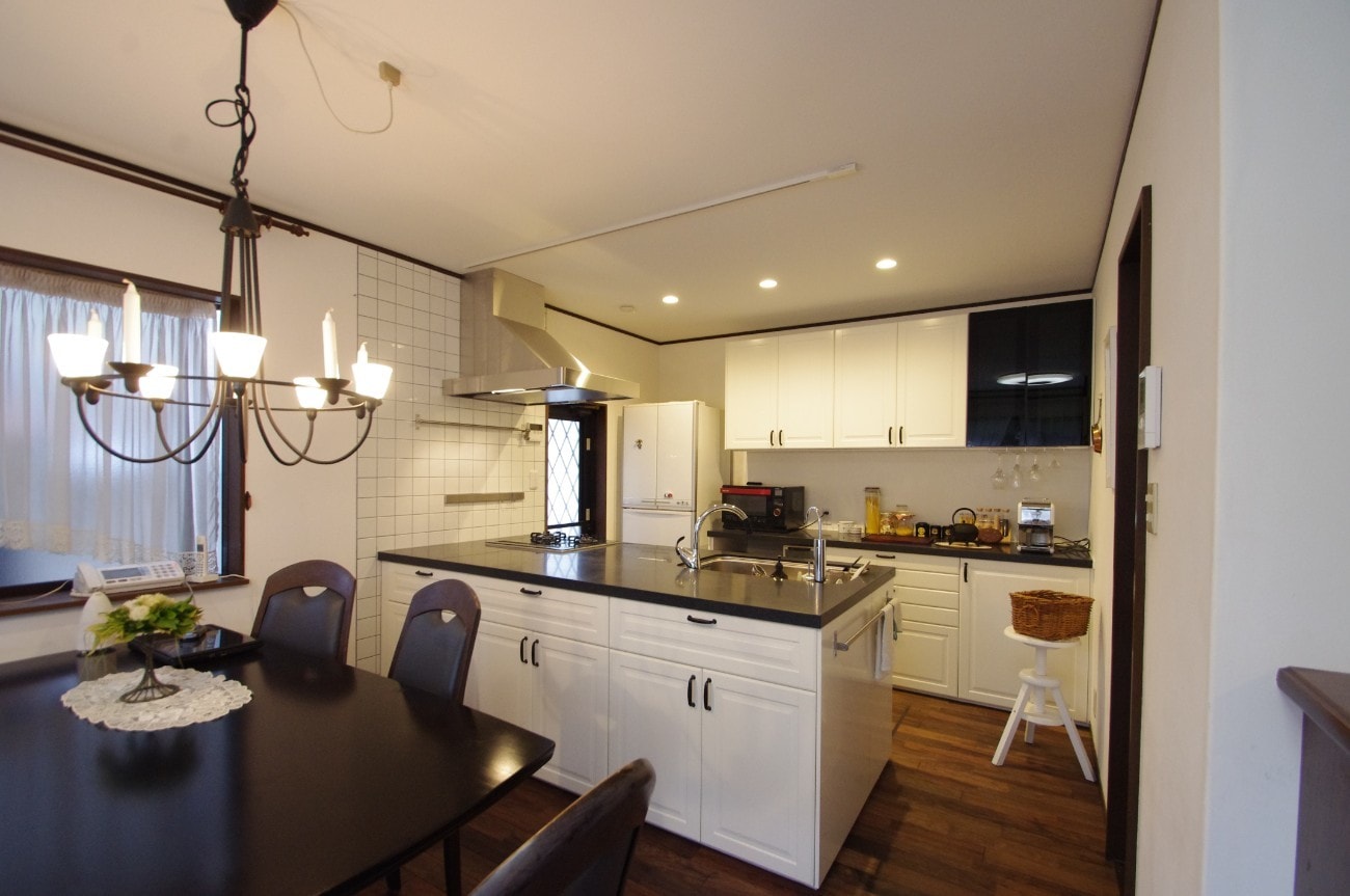 もともとは昔からよくある、吊戸棚や袖壁があって、開口が小さい中途半端な対面キッチンでした。それらをすべて取り払い、開放的なオープンキッチンにリフォーム!