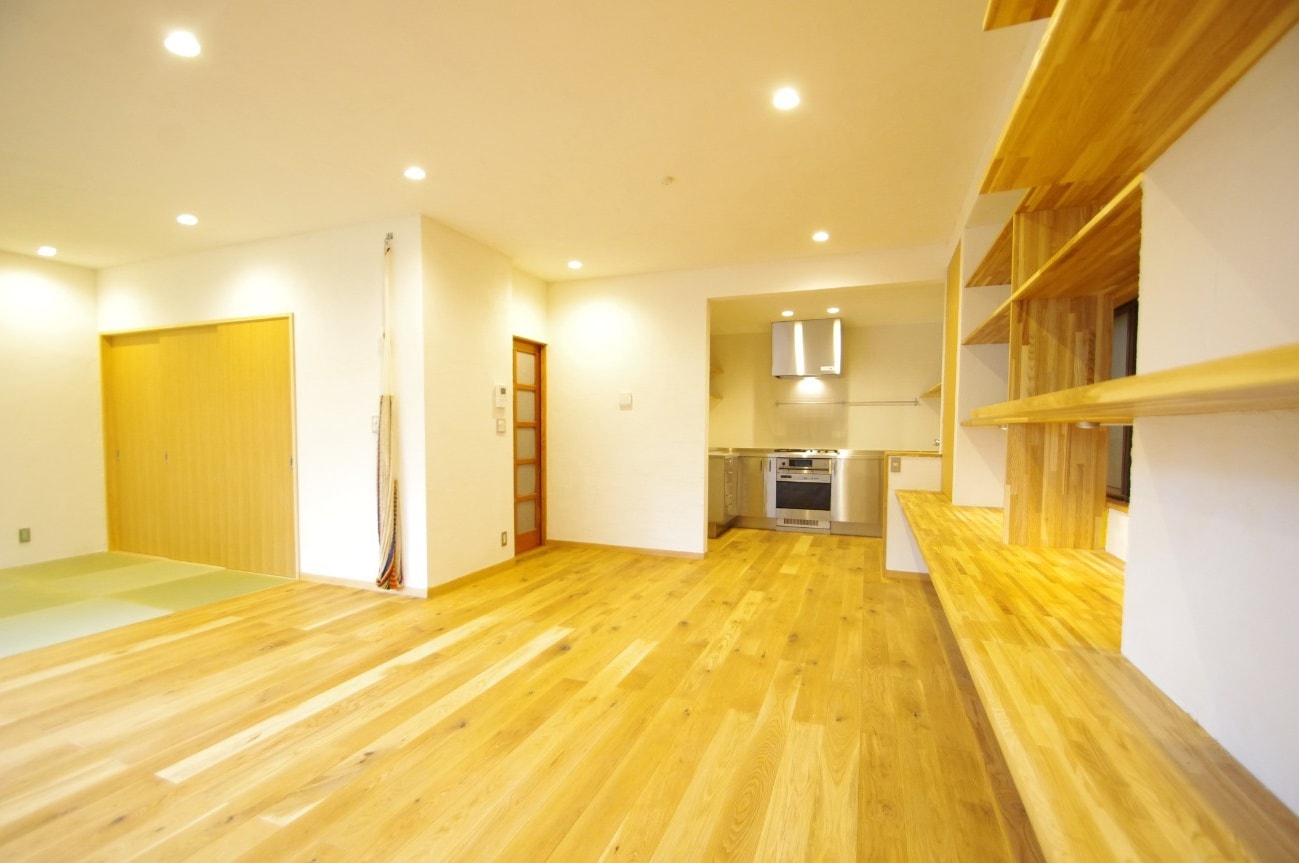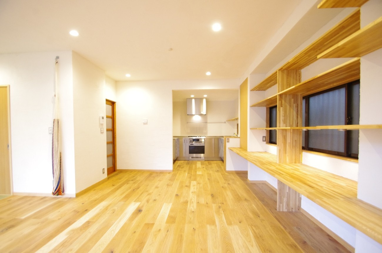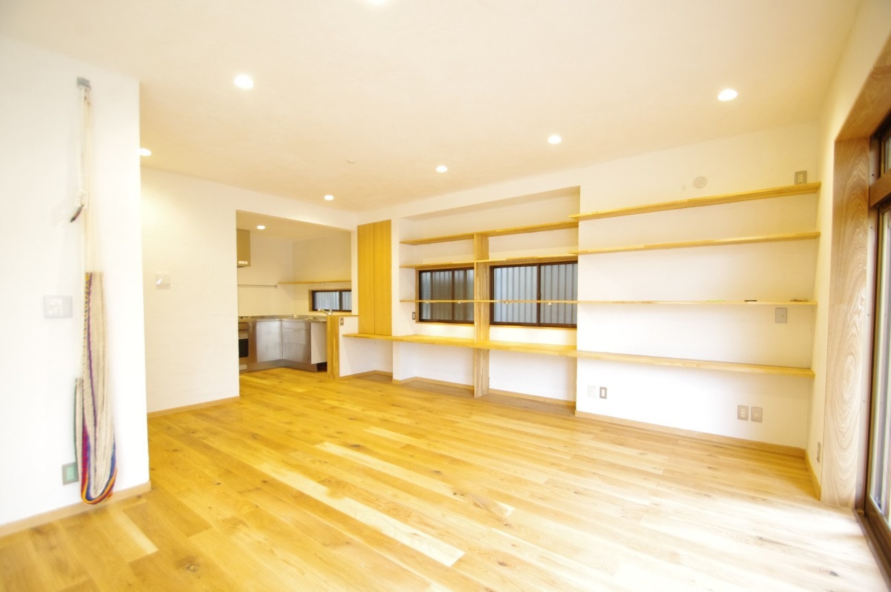 今回は、リビングにワークスペースとして、棚板をかなりのボリュームで設置してみました。