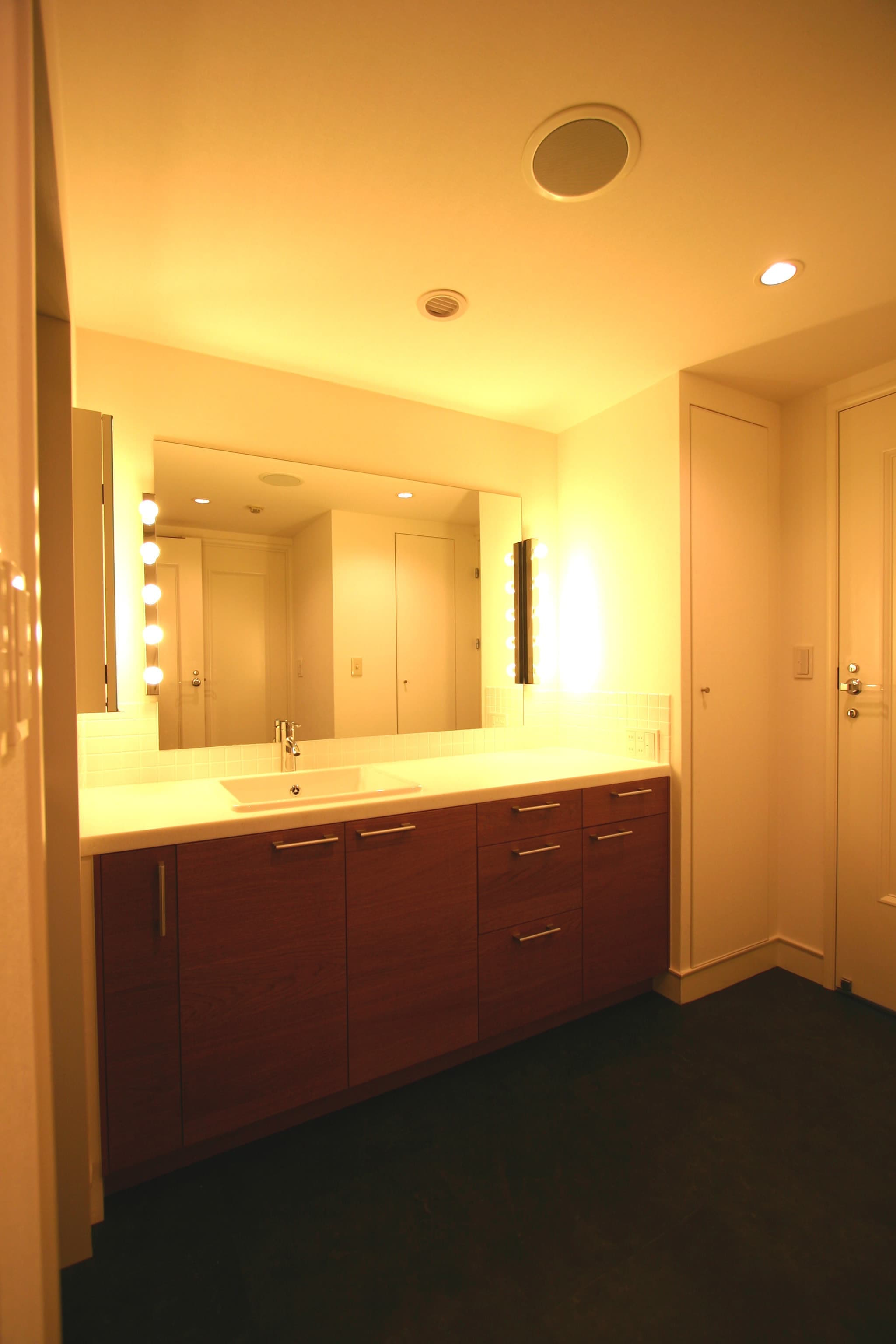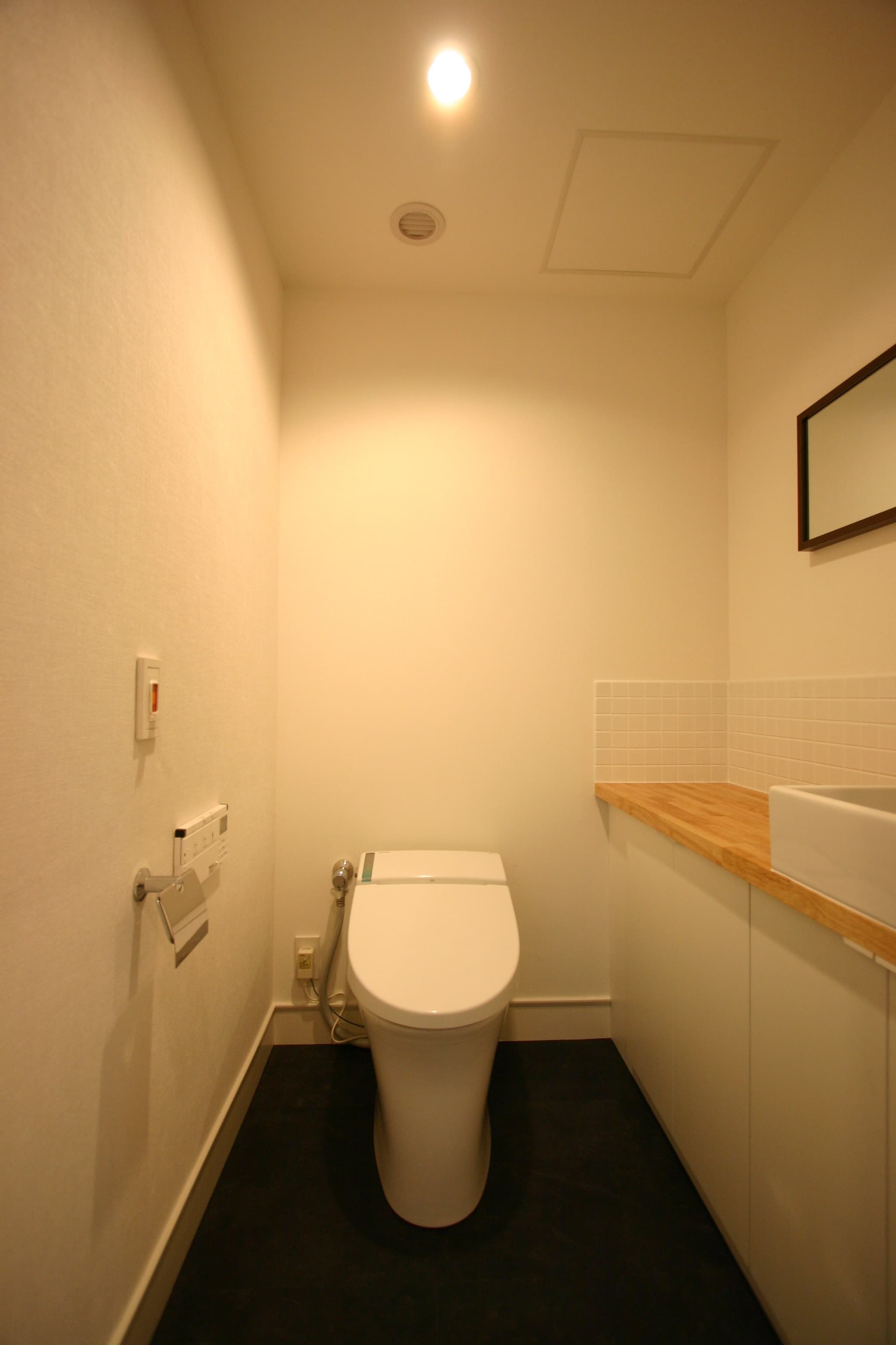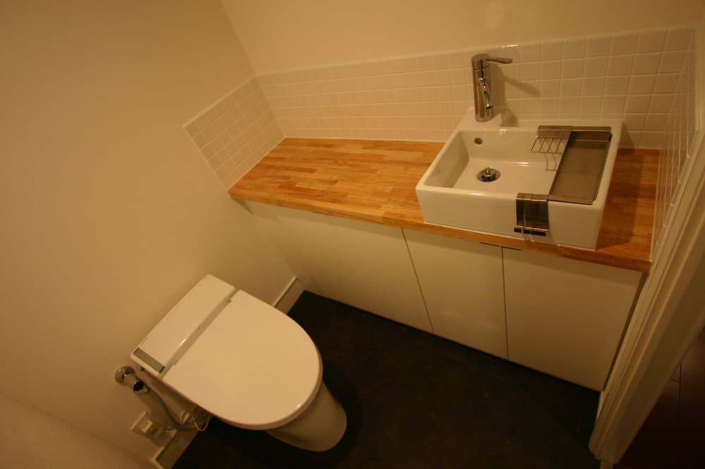 トイレ手洗い、洗面化粧台は、既成の商品ではサイズが合わず、過剰にハイスペックになってしまったので、IKEA商品をカスタマイズしてあります。商品のコストを1/2~2/3程度におさえることに成功。