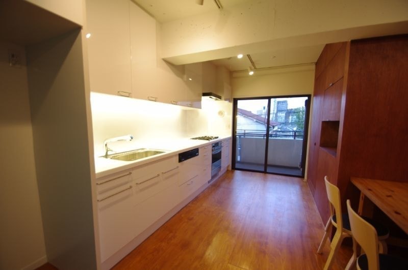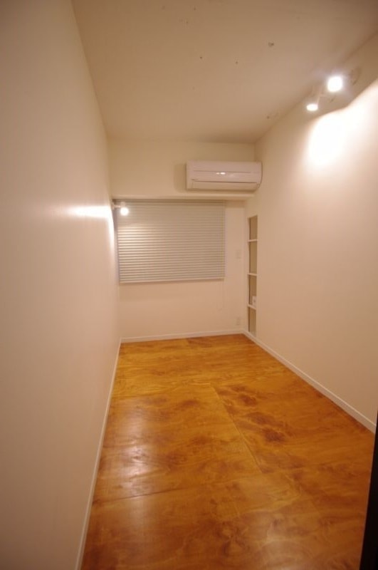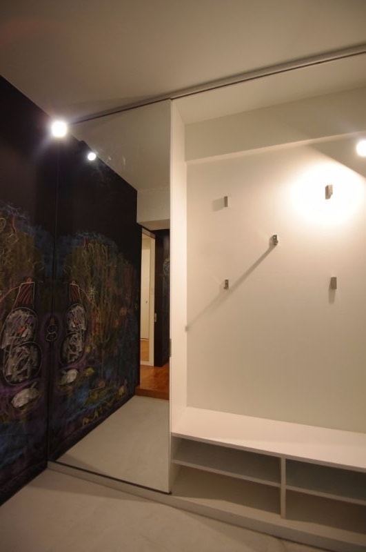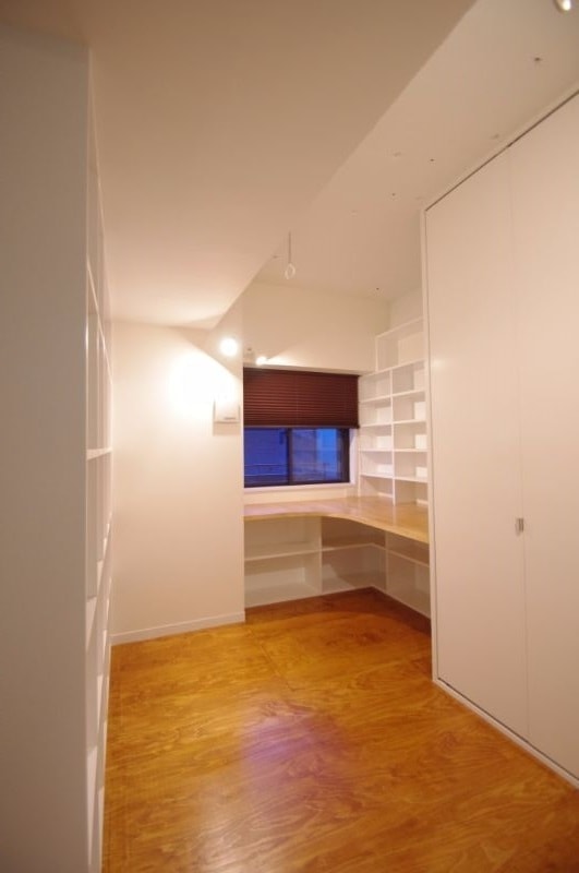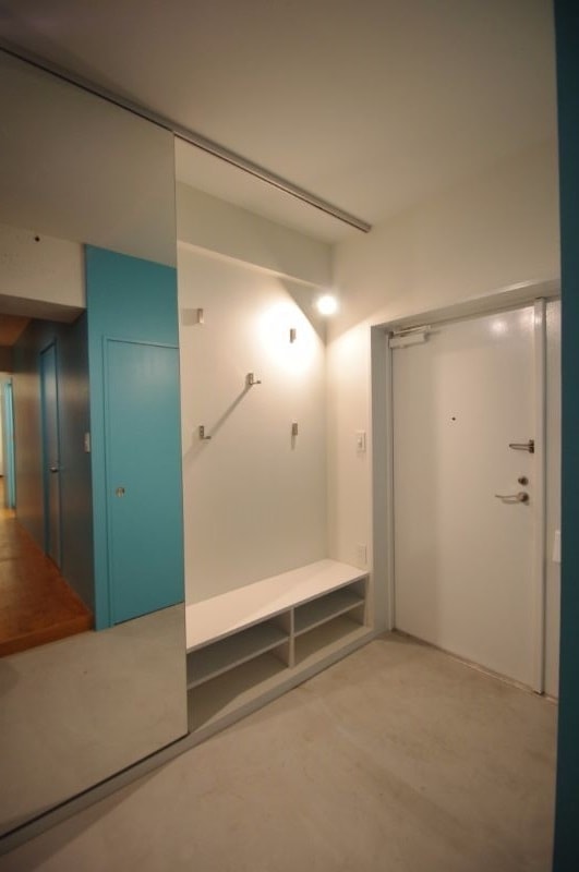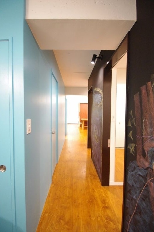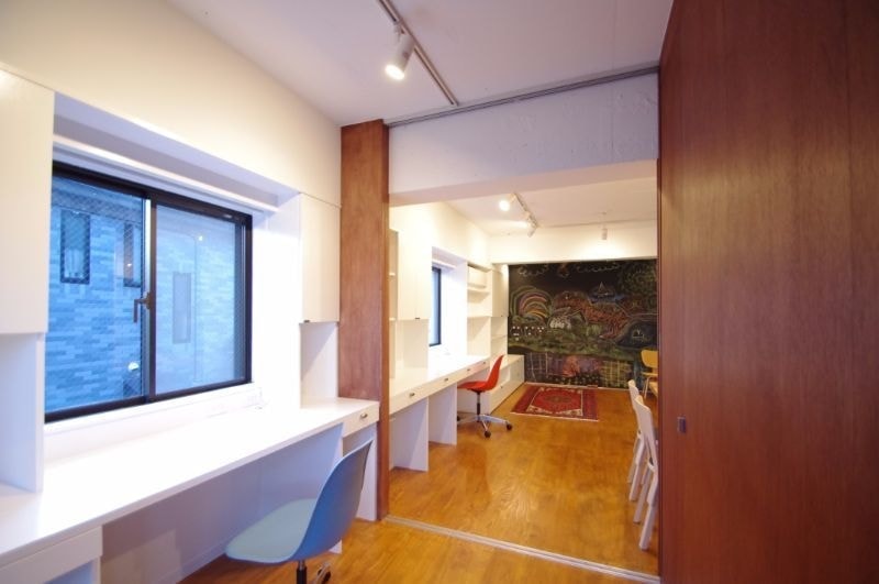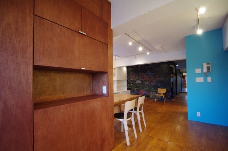 黒板塗装と鮮やかな水色の対比がアーティスティックな空間を演出します。