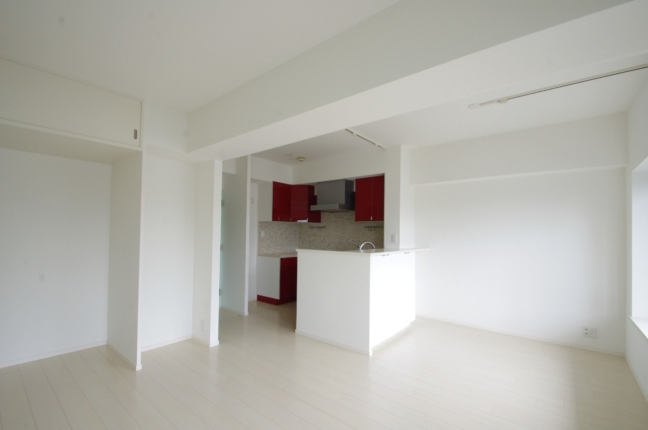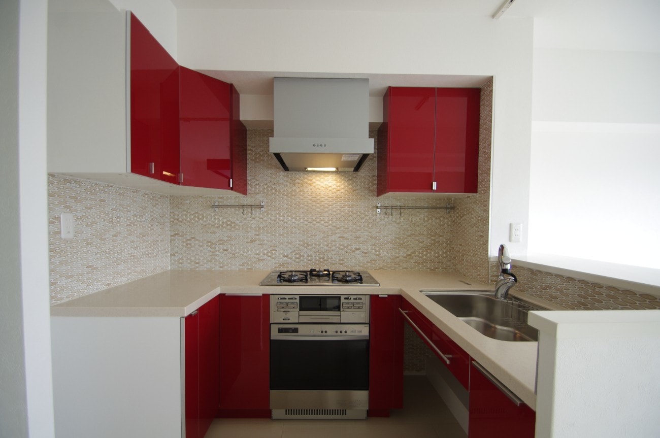 白い雰囲気に、赤いキッチン、パステルカラーの建具、壁が雰囲気をプラス。