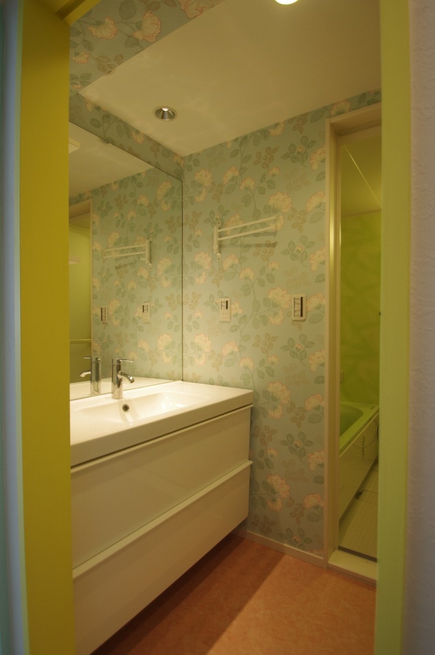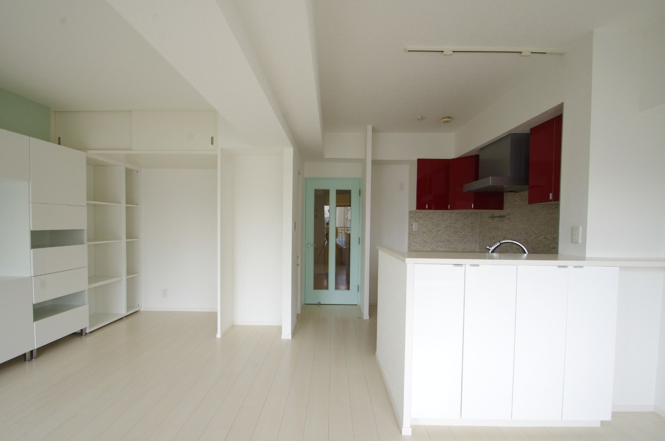 白い雰囲気に、赤いキッチン、パステルカラーの建具、壁が雰囲気をプラス。